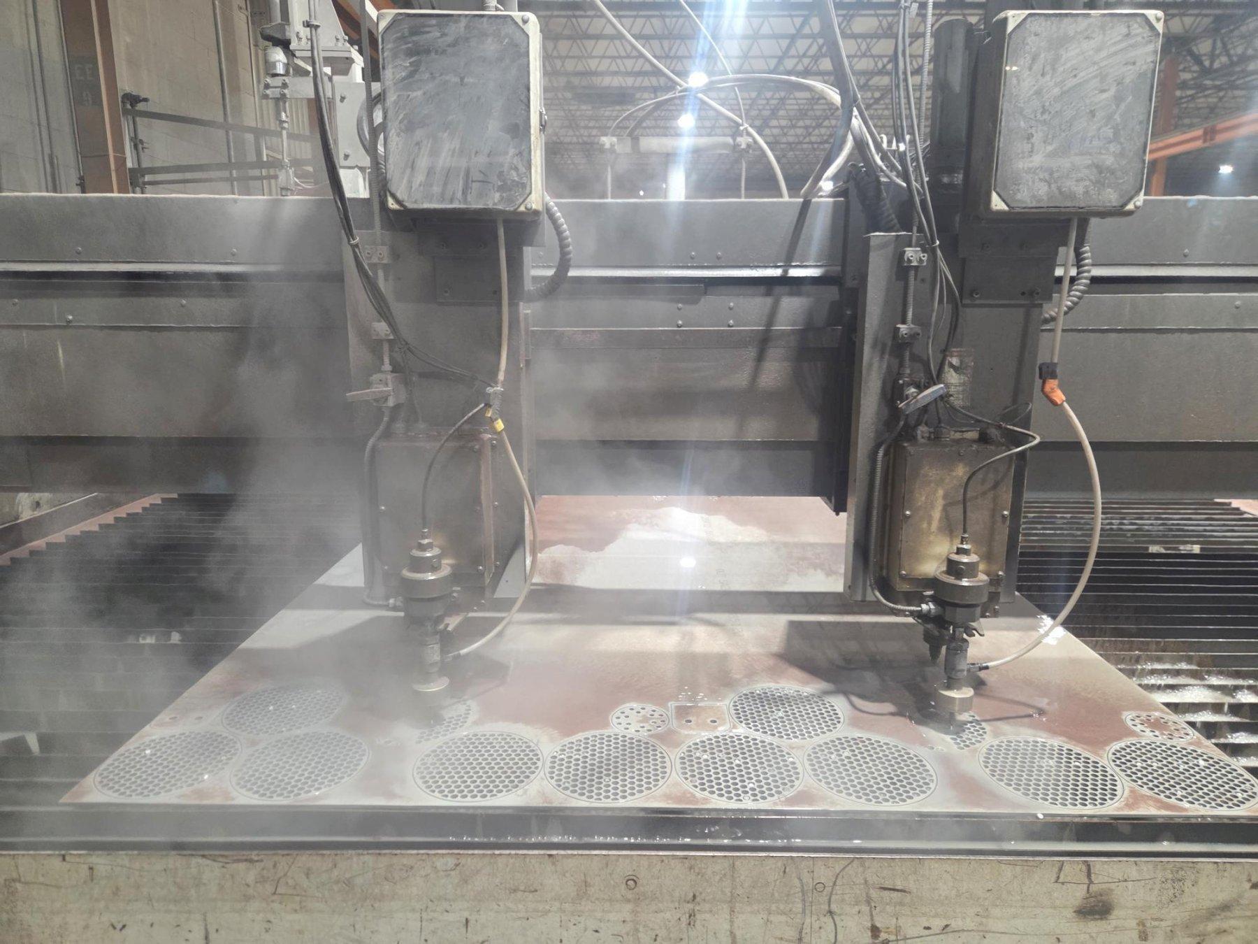 14’ X 21’ Waterjet Cutting System with Aquavision Di Control, Dual Programmable Head Motion System, (2) Jet Edge IP-6050 UHP Intensifier Pumps, 500 IPM Rapid / 300 IPM Contouring and 2,500 Lbs Abrasive Hopper