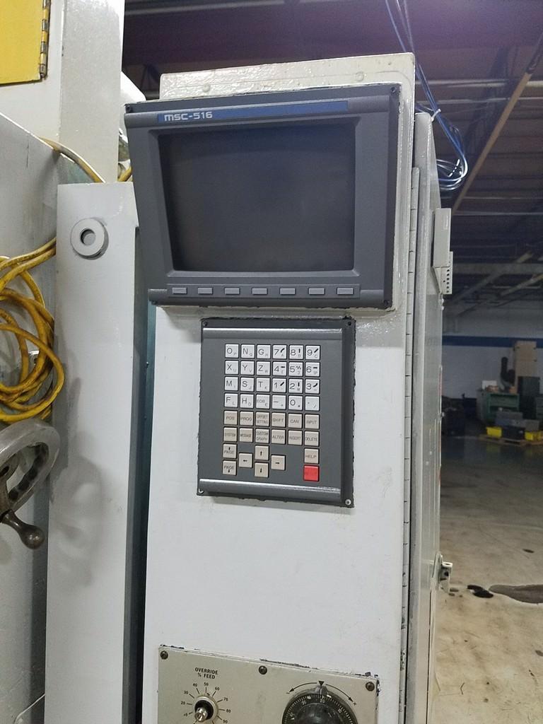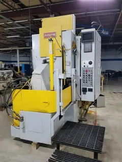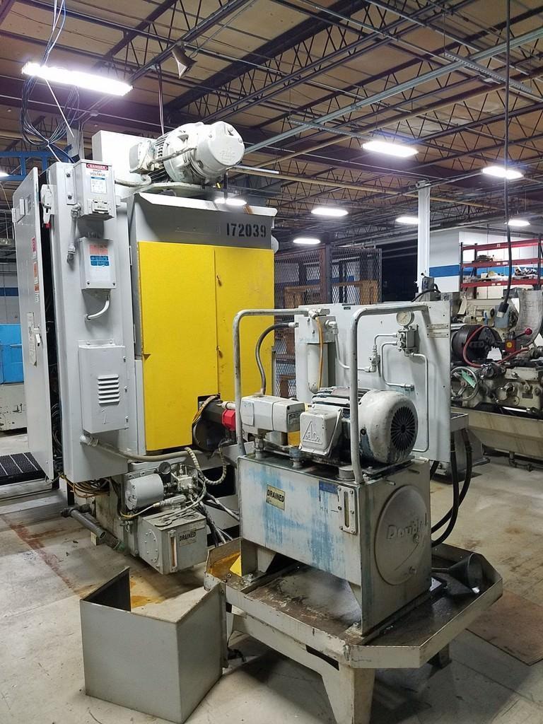 Max Pitch Diameter, External 10" Min Pitch Diameter, Internal 10" Max Diametral Pitch, Spur 4 DP Max Diametral Pitch, Helical 5 DP Max Face Width 4" Max Helix Angle w/ 5" Cutter 45 Deg Max O D of Fixture 19" Max Stroke Length 5" Max Strokes Per Minute 800 SPM Distance - Tabletop to Spindle 8" Feed Per Stroke .001-.040 Cutter Spindle Diameter 3.543" Work Spindle Bore Diameter 5.875" Work spindle bore depth 10" Table Top to Cutter Spindle Underside, - In Uppermost Position 13.23" Worktable C L to Cutter Spindle CL 9.06" Maximum OD of Fixture 19" Rotary Feed Per 1" of Stroke .001"-.012" Rotary Feed For Multi-Pass .001-.020" Radial Feed Range Per Stroke .0001"-.020" Max Radial Feed Per Minute .12" Machine Dimensions 93" x 103" Machine Height 101" Approx. Machine Weight 12,000 Lbs. Equipped With: GE Fanuc Powermate D 2-Axis CNC Control, 1999/2000 Retrofit Tailstock Hydraulically Operated Cutter Guard Assembly Hydraulically Operated Collet Fixture Clamping 15 HP Main Drive Motor NOTE: The Fanuc Powermate control is a 2-axis control and the only changes you need to make are for index or number of teeth in the part. This is done by changing only (2) two change gears in the back of the machine for different numbers of teeth. If you are running production then this should be a non-issue. LOCATION: Inspect Under Power In North Carolina |
