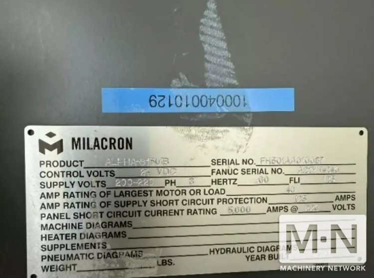 OverviewDescription165 TON 8.8 OZ MILACRON ALPHA-S150iB ROBOSHOT INJECTION MOLDING MACHINE MFG 2021 ONLY APPROX 14,192 HOURS