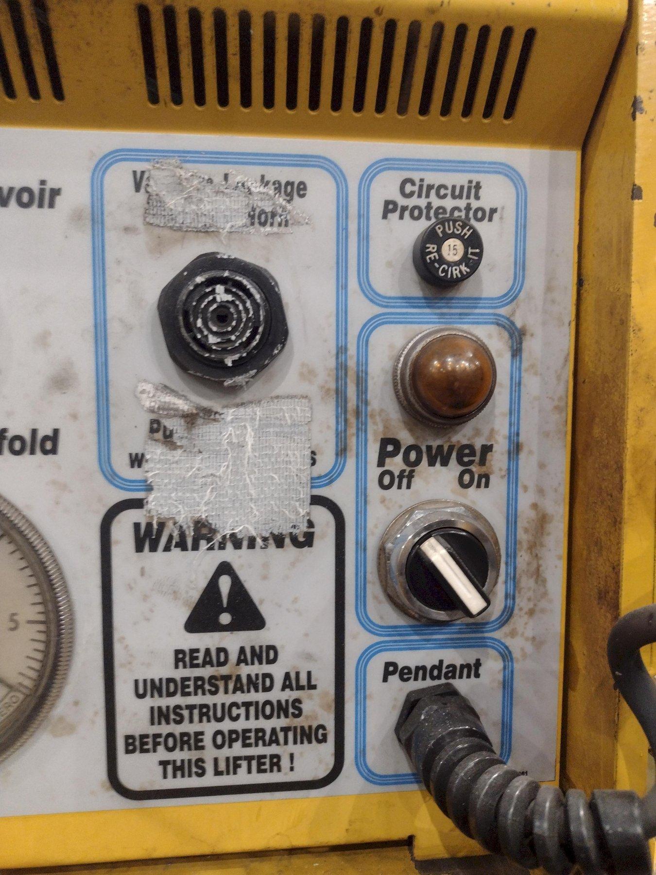 NEW 11/2003 LIFTER MODEL E500M10-200-5/44 CAPACITY 5,000 LBS LOAD LENGTH 20' LOAD WIDTH 8' ARMS 5 CAPACITY 1,000 LBS PER ARM PADS 10 GENERATOR MODEL VPE3-8 UNIT WEIGHT 900 LBS PARKING STANDS PENDANT CONTROL |
