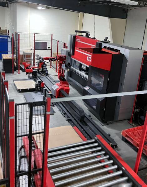 100 Tons X 10’ Robotic Bending Cell with Amada AMNC 3i Touchscreen Control, 7 - Axis (6 - Axis Motion & 1 - Axis of Travel) Amada HGRobot 020 / Yaskawa, DX100 Robotic Arm, Automatic Tool Changer, Automatic Gripper Changer, Roller Table / Conveyor for Finished Parts and Hybrid Drives Systems (Electric & Hydraulic)