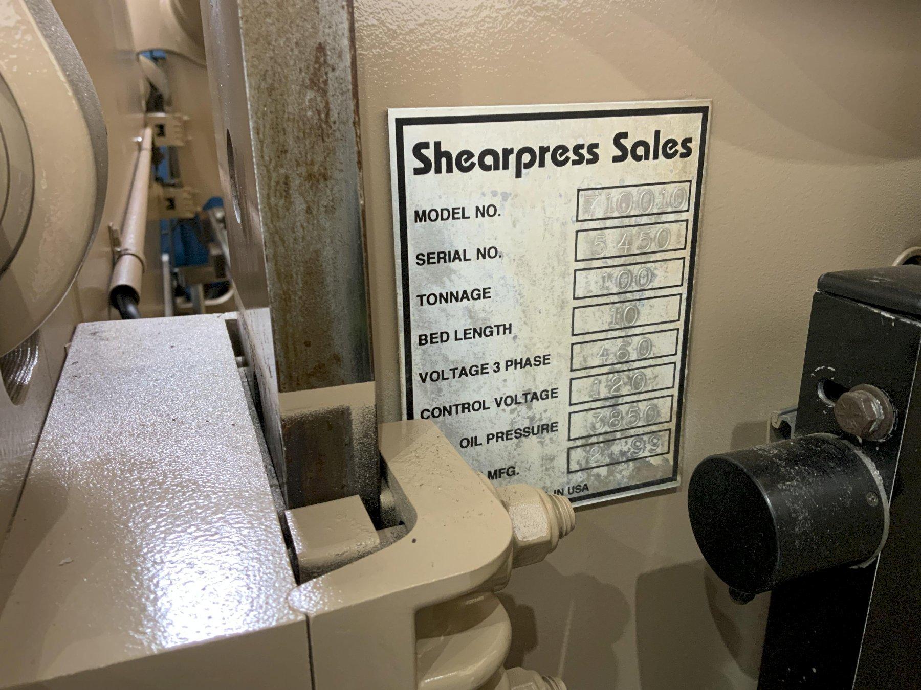 SERIAL ............................ 5450 MODEL ............................. 710010 YEAR NEW .......................... 1999 OVERALL BED AND RAM ............... 120" DISTANCE BETWEEN HOUSINGS ......... 100" RAM STROKE ........................ 8" 2 AXIS CNC BACK GAUGE ............. YES BOTTOM DIE HOLDER ................. YES FOOT AND HAND CONTROLS ............ YES |