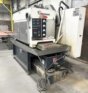 USED TIMESAVERS Lynx 19MWT-DDDD-60 Wet Process Abrasive 4 Belt Deburring/Surface Finishing Machine The Timesavers Lynx 19MWT-DDDD-60 is equipped with four top heads. It has four 6” contact drums powered by four 20 HP motors. The machine is engineered for wet operation. Metal parts are treated with a flood of coolant. Internal shields and seals are designed to control coolant overspray and dispersal. The wet operation eliminates dust and reduces fire hazard. It increases abrasive belt life, eliminates belt loading and improves the consistency and finish of the final products. Manufactured - 2019 Abrasive belt size:........................................... 19” x 60” Motors:........................................................... 20, 20, 20, 20 HP Maximum width stock:................................... 18” Minimum part length:..................................... 8” Machine opening:........................................... 0 – 8.25” Feed speed:..................................................... 6-20 FPM Passline height:............................................... 38”, Constant Voltage/Phase/Frequency:............................. 460/3/60 Approximate full load amps @ 230 volt:......... 253 Compressed air requirements:......................... 8 CFM @ 90 psi Approximate shipping weight:........................ 11,500 lbs. Features: 6” Diameter Contact Drums: Dynamically balanced 6” diameter contact rolls with precision bearings. Machine Design: The machine has a fixed height conveyor for constant pass line height. Each contact drum is adjustable to accommodate thickness. Infeed and Outfeed Holddown Rolls: Rubber-covered, spring-loaded rolls aid in holding sheet metal parts onto conveyor as they pass through the machine. Air Knife Parts Dryer: Air blows and squeegees sheet metal parts on exit end of machine after deburring process. Includes precision top and bottom air knives, squeegee rolls, feed rolls, high efficiency blower, guards and controls. Air Operated Disc Brake: Used to stop the contact roll to assure consistent abrasive belt and belt head stoppage in approximately four seconds. This braking system will not fade under continuous braking and has non-sparking, easily replaceable linings. The brake disc is located on the main motor shaft for easy maintenance. Automatic Advance Paper Media Filter: The automatic indexing coolant system cleans and re-circulates coolant for efficient deburring and finishing. This system is complete with pump, controls, media paper and flow controls to advance the media automatically when necessary. The filter has been designed to fit directly below the machine to minimize floor space. This location allows better evacuation of the coolant directly to the filtration system. Quick Release Outboard Support: Allows fast removal of outboard support to expedite abrasive belt change. Centralized Control Panel: Simple operator controls for machine operation. Conveyor feed, speed, abrasive belt head are controlled at this centralized station. Infeed Stop Bar: A sheet metal gate acts as an emergency stop for the operator when loading the machine. The gate actuates a limit switch which shuts down the abrasive belt head and conveyor feed in emergency situations. Percentage Load Meter: Provided on each head to show the exact percentage of main motor horsepower being used during operation. Electronic Go-To Device: Allows user to digitally enter desired machine opening position. Indicates conveyor speed and conveyor bed position in relation to sanding belt for accurate setup to .001”. The device can store up to ten programs. Variable Speed Conveyor Drive: 10 - 30 FPM A/C variable frequency conveyor drive. Feed drive and take-up rolls will be 6” diameter. Motorized Thickness Adjustment: Thickness setting is motor driven. This allows for quick changes in thickness settings of material to be processed. Reversing Conveyor on Feed System A switch on the control panel will reverse the feed system direction to return parts. No finishing is to be performed in the reverse mode! Automatic Lubrication: The system automatically supplies necessary lubrication to all high-speed bearings at frequent pre-set intervals. 460/3/60 Volt Location: Southern MO Plant |