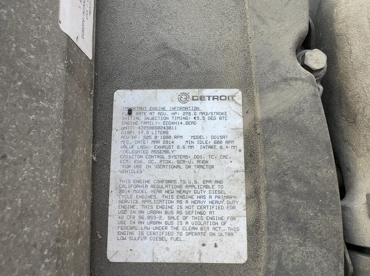 All specifications are assumed to be correct but must be confirmed by the purchasing entity.,Manufacturer: Freightliner Model: Cascadia Year: 2015 Truck Class: Class 8 Truck Type: Sleeper Cab Highway Tractor Configuration: 6×4 Engine Engine Model: Detroit Diesel DD15 Horsepower: 455–505 HP Torque: 1,550–1,750 lb-ft Fuel Type: Diesel Emissions: EPA 2014 compliant Transmission Transmission: Eaton Fuller Manual or Detroit DT12 Automated Speeds: 10-Speed (most common) Axles Front Axle Rating: ~12,000 lbs Rear Axles: Tandem 40,000 lbs Chassis GVWR: ~52,000 lbs Suspension: Air Ride Wheelbase: Typically 230″–250″ depending on sleeper configuration Fuel System Dual Aluminum Fuel Tanks Fuel Capacity: 200–300 gallons Cab & Sleeper Raised Roof Sleeper (60″–72″) Air Ride Driver Seat Power Windows & Locks Cruise Control Climate Control / A/C Sleeper Bunk with Storage Cabinets Brakes & Safety Air Brakes ABS Engine Brake All specifications are assumed to be correct but must be confirmed by the purchasing entity. |
