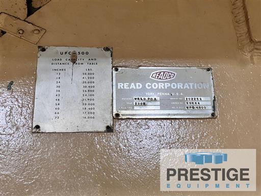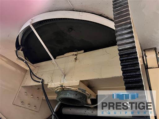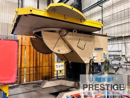 Capacity At 12" Over Hang 50,000 Lbs. Table Size, Approx. 132" x 132" Range Of Height Adjustment 72" To 127" Maximum Tilt Foward 120 Degrees Rotational Speed Range .003-.3 RPM Hole Through Spindle 9" Dia. Tilting Motor 10 H.P. Rotation Motor 5 H.P. Equipped With: Operator Elevator Power Table Rotation Variable Speed Rotation Power Tilting Table Pendant Controls Manually Adjustable Base |