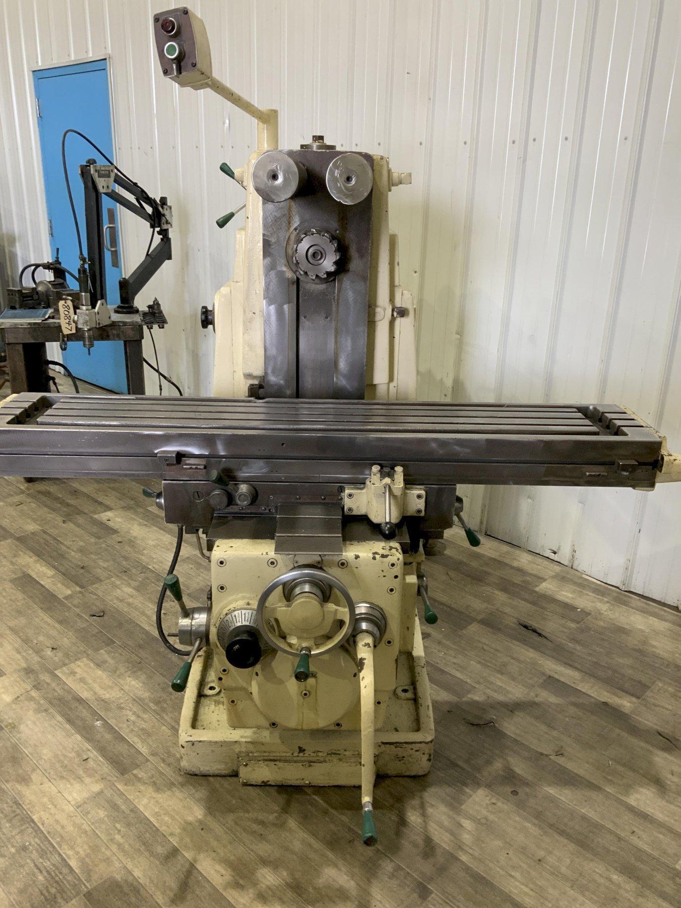 SERIAL ............................ 32-9830 MODEL ............................. 307-S-12 AREA OF TABLE ..................... 62-1/2" X 12" SPINDLE SPEEDS .................... (24) 25 TO 2000 RPM LONGITUDINAL AND CROSS FEEDS ...... (16) 1/4 TO 32 IPM VERTICAL FEEDS .................... (16) 1/8 TO 16 IPM LONGITUDINAL TRAVEL ............... 34" CROSS TRAVEL ...................... 12" VERTICAL TRAVEL OF KNEE ........... 18" TAPER IN SPINDLE .................. #50 NS TOP OF TABLE TO CENTER OF SPINDLE . 0" MIN, 18" MAX TABLE SWIVELS, LEFT OR RIGHT ...... 47 DEGREES RAPID TRAVERSE .................... 150 IPM OVERARM SUPPORT ................... YES COOLANT ........................... YES SPINDLE MOTOR, HORSEPOWER ......... 7-1/2 FEED MOTOR, HORSEPOWER ............ 1-1/2 |