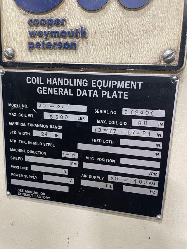 Three leaf mandrel Adjustable coil keeper arms Front mounted expansion ID Range 13" - 21" (with removable riser pads) Air brake mounted on main spindle (adjustable tensioning) Coil hold down arm CWP Powered Coil Straightener Model No. 24C Seven straightener rolls x 2.75" diameter Entry pinch rolls with air operated adjustments Adjustable stock width edge guides Inclined head Exit cascade loop support rollers Variable speed payout Operator's controls Jog forward and reverse Variable speed loop control |