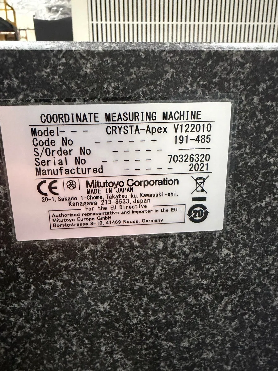 OverviewManufacturer: MITUTOYOModel: Crysta Apex V122010 Year: 2021 Stock #: 11262 Status: For Sale Serial #: 70326320 DescriptionUsed 2021 Mitutoyo Crysta-Apex V122010 CMM/Scanner offers precise measurement with a Renishaw-equipped setup. Features include 47.2"x78.7"x39.3" travel, 5,511 lbs loading capacity, and air bearings. Comes with MCOSMOS-3 V5.0 software. Brand: Mitutoyo