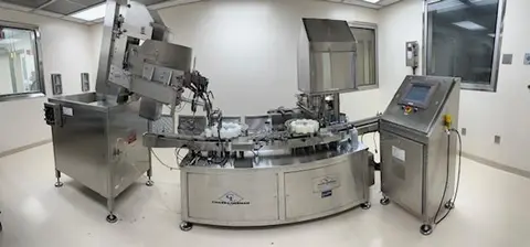 All specifications are assumed to be correct but must be confirmed by the purchasing entity.,Rate: Up To 120 CPM Filling Capacity: 5mL – 360mL Cap Range: 8 – 32 mm Main Motor: DC Electrical: 120V, 60Hz, Single Phase Air Requirement: 3 – 5 CFM @ 90 PSI All specifications are assumed to be correct but must be confirmed by the purchasing entity.,Also includes: Palace Packaging Machines Model P-2-SSE-6 Bottle Sorter Vibromatic Inc. Vibratory Table – Dual Drive Chase-Logeman VTS Vial Transfer System Keyence Bottle Detection Vision System Assorted change and spare parts. All specifications are assumed to be correct but must be confirmed by the purchasing entity. |
