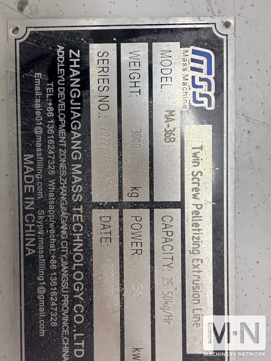 OverviewDescription35 MM ZHANG JI GANG TWIN SCREW PELLETIZING EXTRUSION LINE MFG 2022 UNDER WATER PELLETIZER MODEL MA-36B 25-50 KG/HR