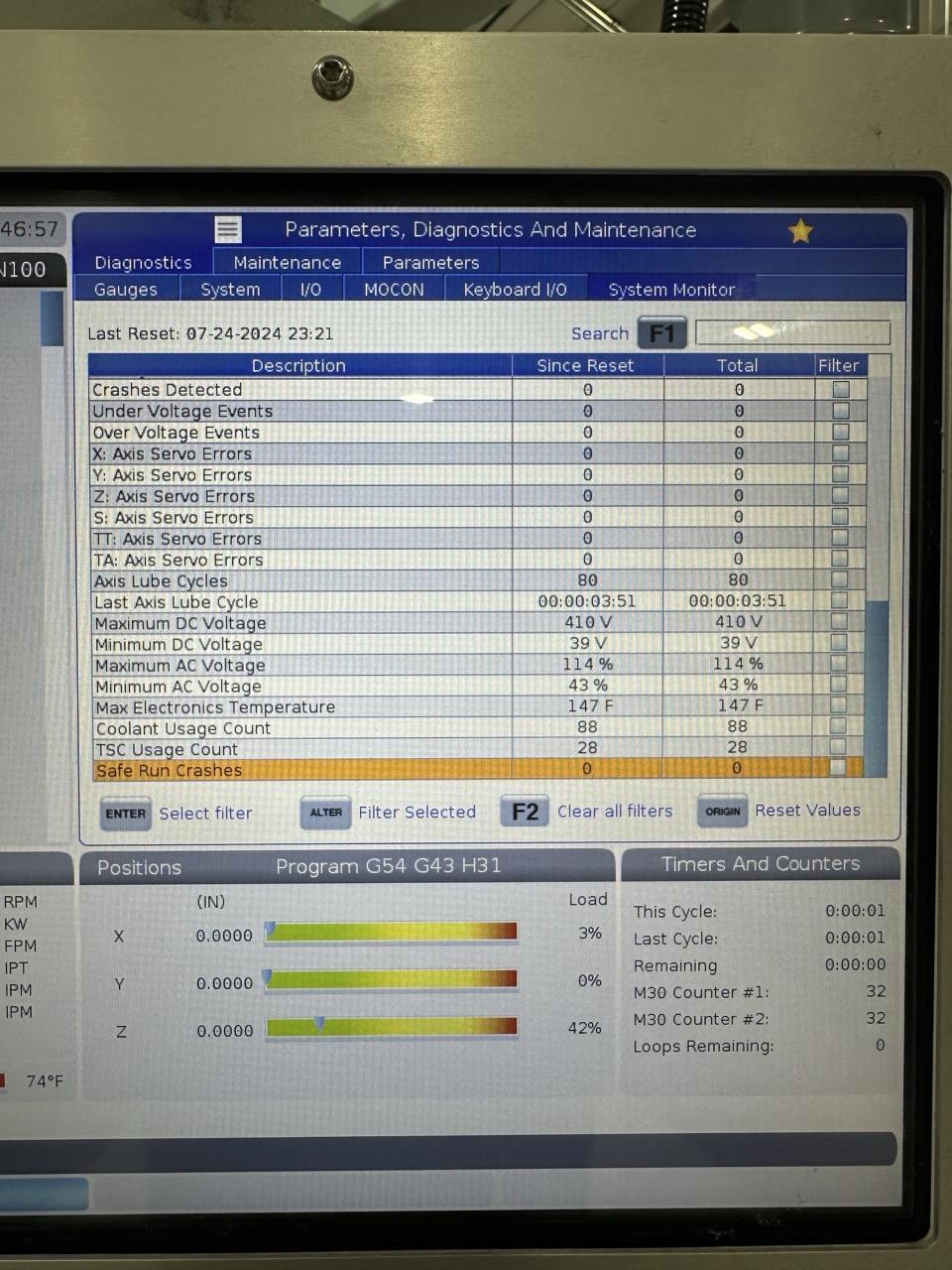 All specifications are assumed to be correct but must be confirmed by the purchasing entity.,Equipped With: All specifications are assumed to be correct but must be confirmed by the purchasing entity.,Haas CNC Control High-Performance 10,000-rpm Spindle 50+1 Side-Mount Tool Changer Wireless Intuitive Probing System Probe Riser Block Auxiliary Coolant Filter Chip Tray Filter Kit Through-Spindle Coolant, 300 psi (21 bar) Window Air Blast Chip Auger 95-Gallon Coolant Tank Standard Low-Volt Transformer CNC Control Cabinet Cooler 32 GB Expanded Memory Early Power-Failure Detection Module Ethernet Interface HaasConnect: Remote monitoring HaasDrop Second Home Position High-Speed Machining Media Display M-Code; M130 Large Remote Jog Handle with Touchscreen Display Rigid Tapping Power Surge Protection WiFi Connection for the Haas Control Tooling Plate Table Machine Anchoring Kit All specifications are assumed to be correct but must be confirmed by the purchasing entity. |