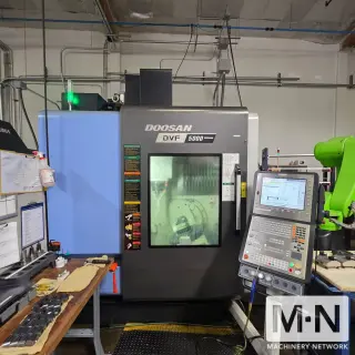 OverviewDescription2020 Doosan DVF-5000 5-Axis Vertical Machining Center with Heidenhain TNC640 CNC, Fanuc Robot CR-35ia, probe, tool presetter, LNS chip conveyor. Specs: 42 hp spindle, 18,000 RPM, ATC 120 tools. X: 24", Y: 17", Z: 15", HSK A63 taper. Heidenhain TNC640 CNC Control