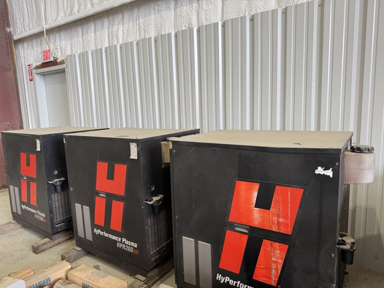 All specifications are assumed to be correct but must be confirmed by the purchasing entity.,Power Sources: (3) Hypertherm HPR260X – Output Range: 30–260 amps (each) – Mild Steel Capacity: Up to 2-1/2″ – Stainless Capacity: Up to 2″ – Aluminum Capacity: Up to 2″ – Control: CNC programmable, CAD/CAM compatible All specifications are assumed to be correct but must be confirmed by the purchasing entity. |