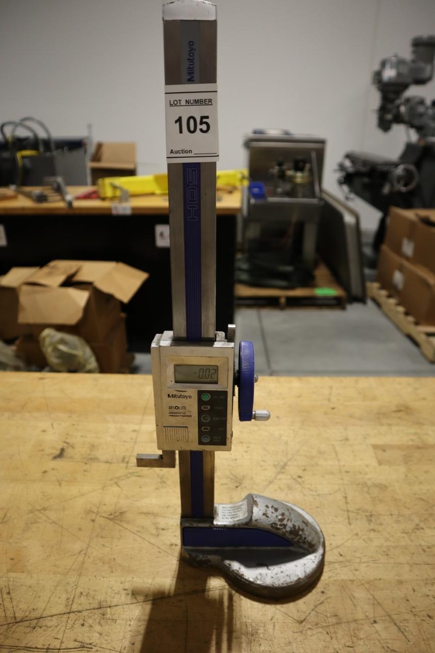 View Auction Item at: https://www.machinesused.com/lots/50039">, Lot 105: Mitutoyo Absolute Digimatic HDS‑H12"C Height Gage Equipped With: Note: Needs Battery Description: The Mitutoyo Absolute Digimatic HDS‑H12"C height gage is a precision digital measuring instrument designed for accurate vertical measurement, layout, and inspection tasks. Equipped with Mitutoyo’s Absolute Encoder technology, this height gage eliminates the need to re‑zero after power‑on, reducing setup time and preventing cumulative measurement errors. Built for both shop‑floor and inspection room use, the HDS‑H12"C features a rigid column, smooth slider movement, and a clear digital display for fast, reliable readings. Its robust construction and precision performance make it a trusted solution for machinists, tool rooms, and quality control departments. Manufacturer: Mitutoyo Model: Absolute Digimatic HDS-H12"C Main Unit Approx Weight: 10.00 lbs Main Unit Dimensions (in inches): Length: 8.00" Width: 5.00" Height: 20.00" Specs: Seller Company: United Standards Lab Seller Contact: Machinesused.com April Multishop Phone: (763) 745-1166 Item Location: United Standards Lab, 2410 Niagara Lane N., Plymouth, MN 55447 Location Contact: Machinesused.com April Multishop Phone: (763) 745-1166 Inspection Date & Time: By Appointment Normal Business Hours Monday-Friday Removal Dates and Times: This item must be removed between Wednesday, April 29, 2026 and Friday, May 8, 2026 |