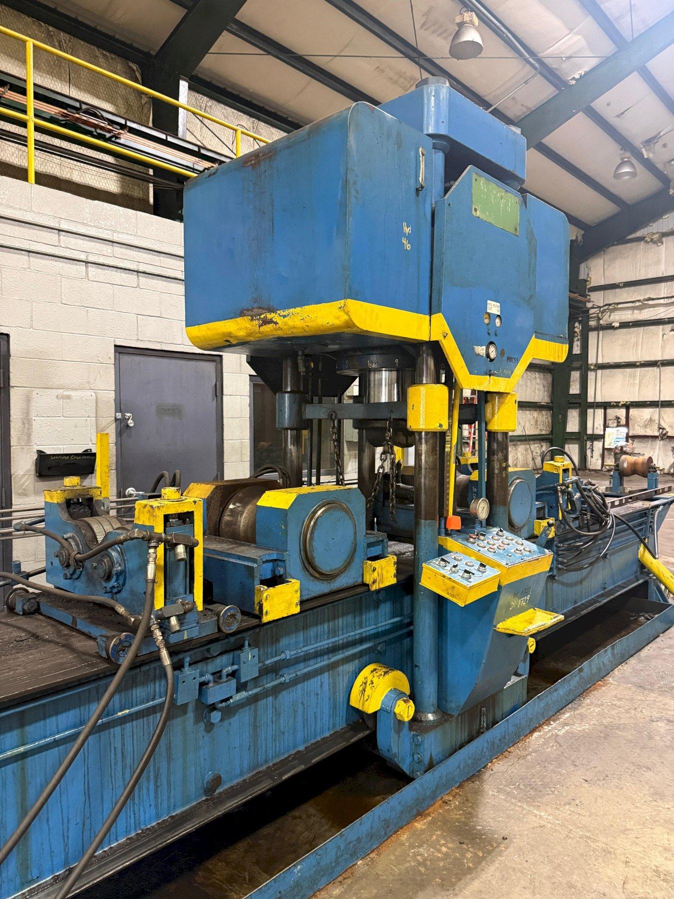 CAPACITY ..................... 400 TON STROKE OF RAM ................ 15" RAM BORE DIAMETER ............ 16" DAYLIGHT RAM TO BED .......... 26" MAX LENGTH OF TABLE .............. 360" (30 FT) WIDTH OF TABLE ............... 29-1/2" DISTANCE BETWEEN POSTS ....... 31" TABLE HEIGHT FROM FLOOR ...... 36-1/2" PRESS HEAD TRAVERSE .......... 26' - POWERED PRESS HEAD TRAVERSE .......... CHAIN DRIVEN PRESS HEAD DESIGN ............ 4-POST, TIE-ROD TONNAGE CONTROL .............. HAND LEVER TONNAGE PRESSURE GAUGE ....... YES PUSH BUTTON TABLE CONTROLS ... YES "V" STYLE PUSH BLOCKS ........ MOVABLE ON BED MATERIAL LIFT BLOCK .......... MOVABLE ON BED LIFT BLOCK HYD CYL STROKE .... 5" POWER TURNING ROLLS .......... YES, HYDRAULIC HYDRALIC UNIT - LIFT BLOCKS .. 5 HP HYDRAULIC UNIT - FOR PRESS ... 15 HP |