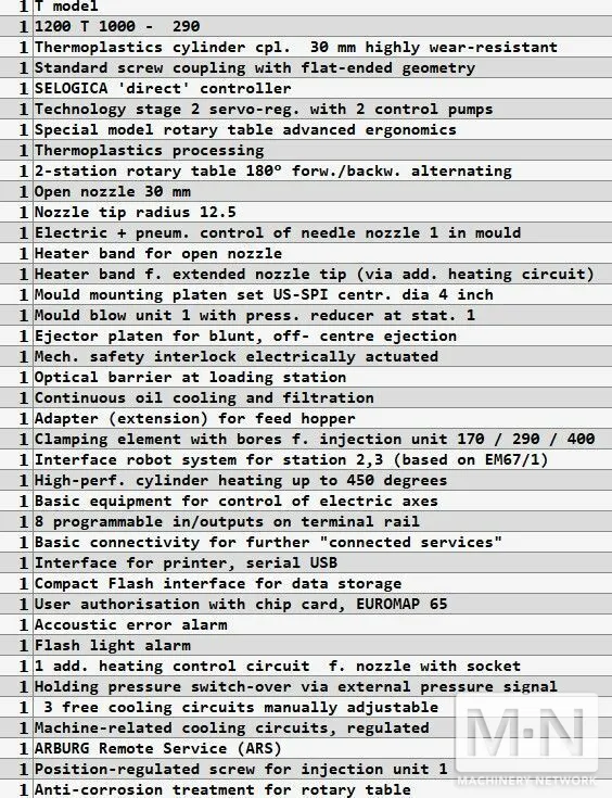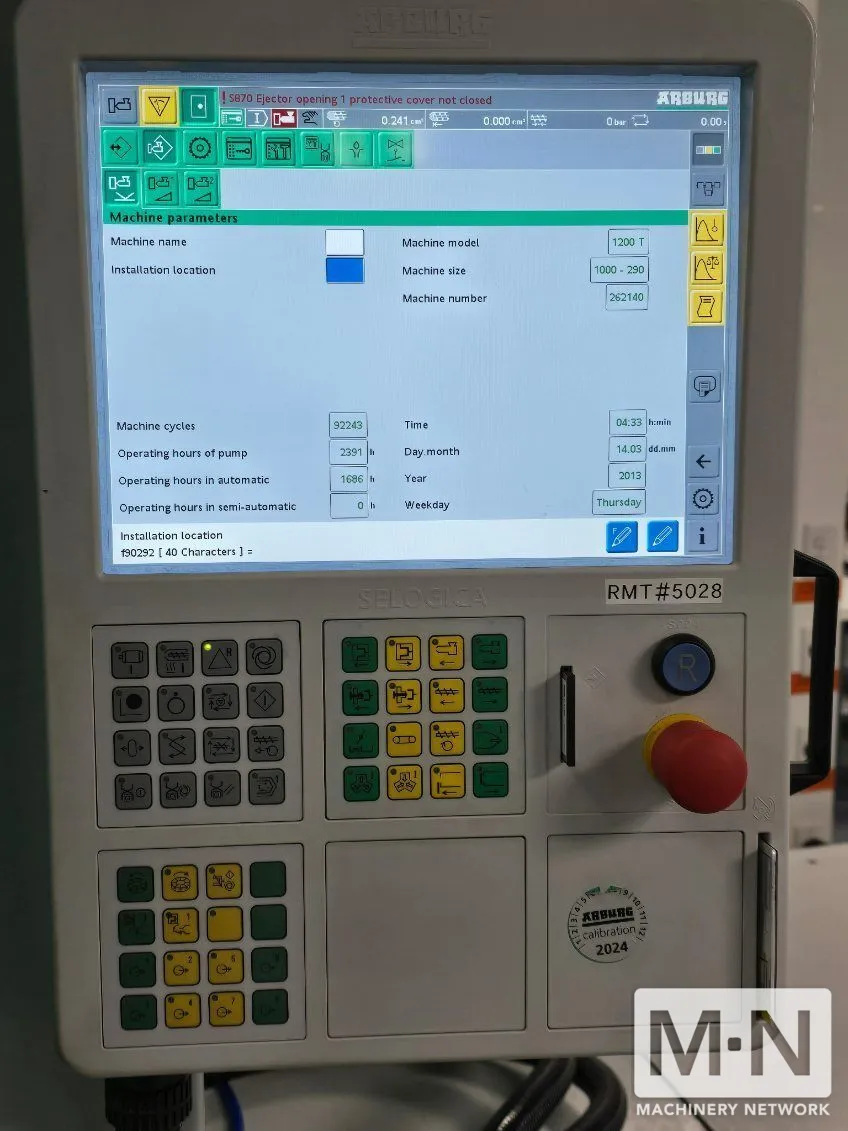 OverviewDescription100 TON 3.4 OZ ARBURG MODEL 1200T-1000-290 VERTICAL CLAMP INJECTION MOLDING MACHINE MFG 2022 * LOW HOURS SELOGICA DIRECT CONTROL