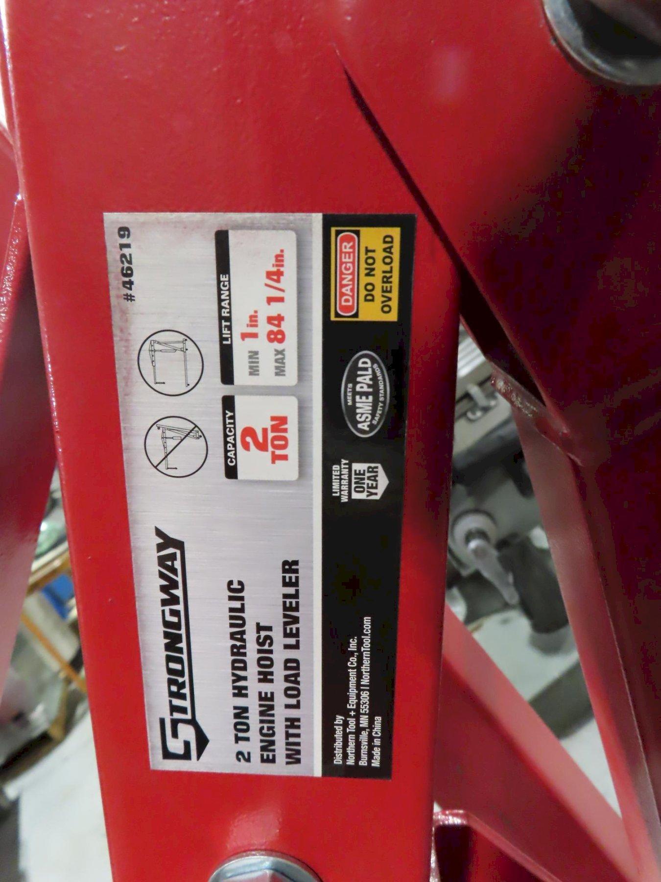 View Auction Item at: https://www.machinesused.com/lots/50272">, Lot 306: Strongway 2 Ton Hydraulic Engine Hoist with Lift Lever, Portable Equipped With: Lift Range; Mininum of 1", Maximum of 84-1/4" Manufacturer: Generic Model: Generic Main Unit Approx Weight: 0.00 lbs Main Unit Dimensions (in inches): Length: 0.00" Width: 0.00" Height: 0.00" Seller Company: John Sloan Seller Contact: Machinesused.com April Multishop Phone: (763) 745-1166 Item Location: John Sloan, 2410 Niagara Lane N, Plymouth, MN 55447 Location Contact: Machinesused.com April Multishop Phone: (763) 745-1166 Inspection Date & Time: By Appointment Normal Business Hours Monday-Friday Removal Dates and Times: This item must be removed between Wednesday, April 29, 2026 and Friday, May 8, 2026 |