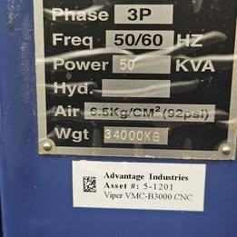 For sale is a 2000 Viper VMC-B3000 CNC Bridge Mill, a heavy-duty CNC milling machine designed for large-part machining and applications requiring extended travels and rigidity.