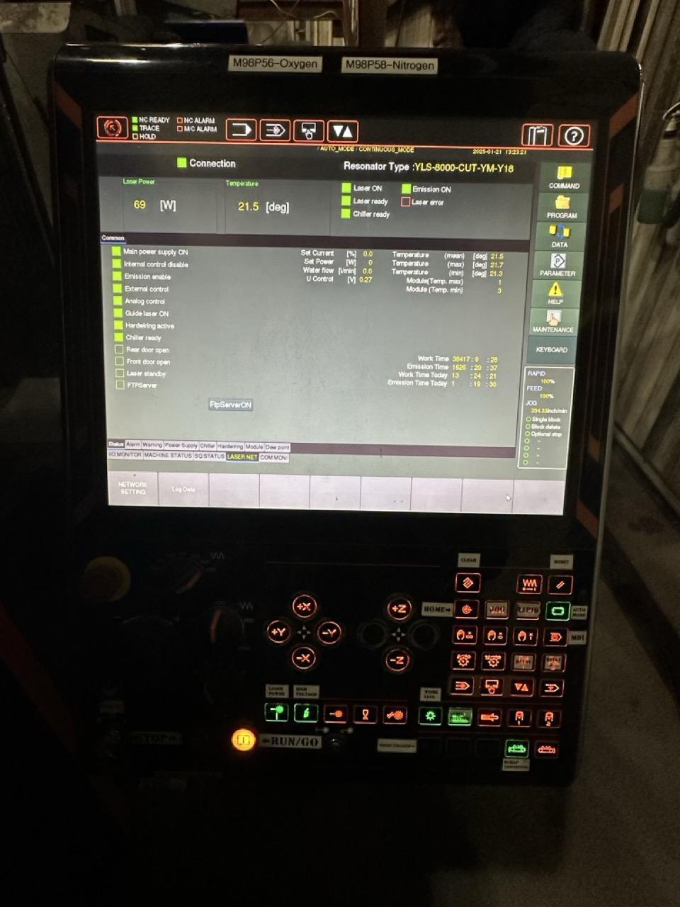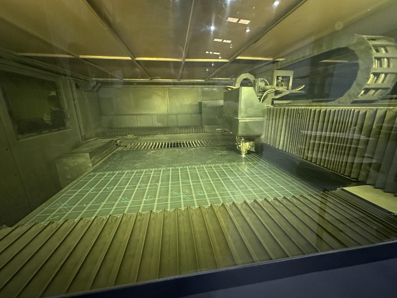 All specifications are assumed to be correct but must be confirmed by the purchasing entity.,Travels: X-Axis: 160″ Y-Axis: 80″ Z-Axis: 4-5″ All specifications are assumed to be correct but must be confirmed by the purchasing entity.,Rapid Traverse Rate: X/Y-Axis: ~4,725 ipm Z-Axis: ~6,500 ipm All specifications are assumed to be correct but must be confirmed by the purchasing entity.,Max Sheet Weight: ~2,200 lbs per pallet Table Load Capacity: ~180 lbs/sq ft All specifications are assumed to be correct but must be confirmed by the purchasing entity.,Equipped With: Mazatrol PreviewG Control IPG Resonator Shuttle Table (dual pallet changer) Dust Collector Scrap Conveyor 4th Assist Piping Nozzle Centering Camera High Accuracy Camera Regulator Start-Up Kit II All specifications are assumed to be correct but must be confirmed by the purchasing entity.,Electrical Requirements: 480V/3Ph/60Hz Dimensions: approx. 420″ x 120″ x 84″ Weight: approx 47,024 lbs All specifications are assumed to be correct but must be confirmed by the purchasing entity. |