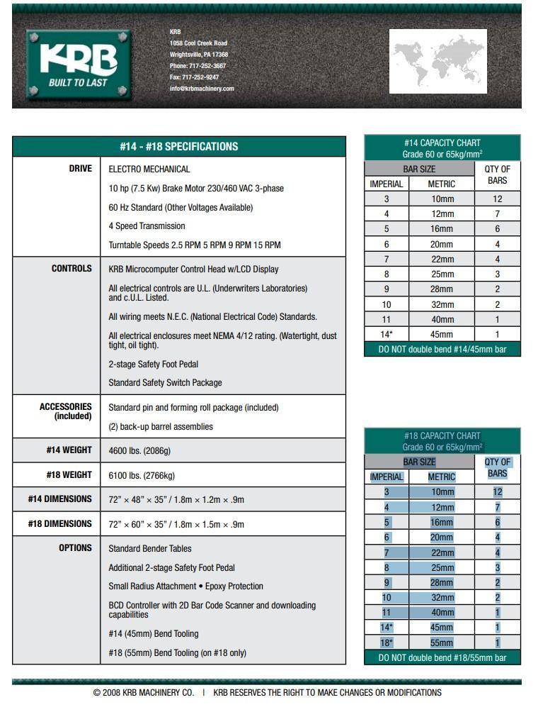MODEL 18M 4 Speed Transmission Turntable Speeds 2.5 RPM 5 RPM 9 RPM 15 RPM CONTROLS KRB Microcomputer Control Head w/LCD Display 10 hp Motor #18 CAPACITY CHART Grade 60 or 65kg/mm2 BAR - IMPERIAL METRIC - SIZE QTY OF BARS 3 10mm 12 4 12mm 7 5 16mm 6 6 20mm 4 7 22mm 4 8 25mm 3 9 28mm 2 10 32mm 2 11 40mm 1 14 45mm 1 18 55mm 1 |