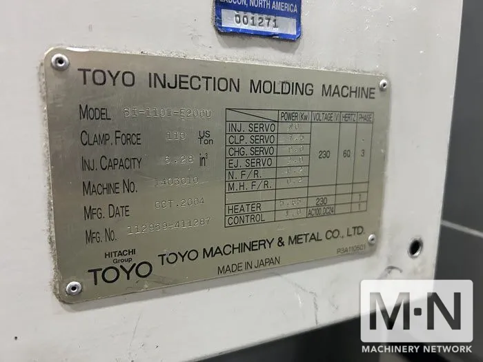 OverviewDescription110 TON 3.8 OZ TOYO MODEL SI110III-E200U ELECTRTIC INJECTION MOLDING MACHINE MFG 2004 |
