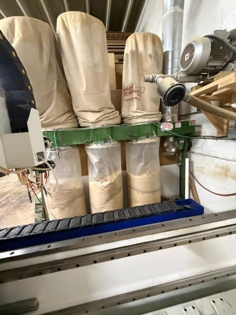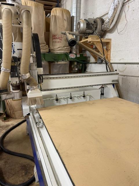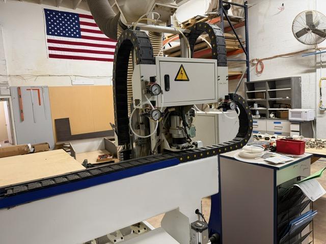 All specifications are assumed to be correct but must be confirmed by the purchasing entity.,Table Size: 60″ X 120″ Cutting Area: 5′ X 10′ Number Of Axis: 3 X-Axis Travel: 61″ Y-Axis Travel: 121″ Z-Axis Travel: 9.8″ Spindle Motor: 12 HP Spindle Speed: 1,000 To 24,000 RPM Spindle Taper: ISO 30 Collet System: ER-32 Tool Changer: 8 Station Maximum Rapid Traverse: 1,600 IPM X And Y Axis Speed: 1,575 IPM Maximum Cut Feed Rate: 800 IPM Vacuum Table: 6 Zone High Flow Vacuum Table Vacuum Pump: 235 CFM Dry Vacuum Pump Vacuum Pump Motor: 15 HP Air Requirement: 90 PSI Air Consumption: 16 CFM Shipping Dimensions: 155″ X 92″ X 65″ Approximate Weight: 5,500 Lbs. All specifications are assumed to be correct but must be confirmed by the purchasing entity.,Equipped With: All specifications are assumed to be correct but must be confirmed by the purchasing entity.,Dust Tech Dust Collection System Syntec 6MA CNC Control 12 HP Air Cooled HSD Spindle 8 Position Linear Tool Changer ISO 30 Tool Holders ER-32 Collet System 6 Zone Vacuum Table 235 CFM Dry Vacuum Pump Automatic Tool Height Calibration Central Lubrication System MPG Hand Held Remote Pop Up Reference Stops Dust Hood With 6″ Manifold Servo Drive System All specifications are assumed to be correct but must be confirmed by the purchasing entity. |