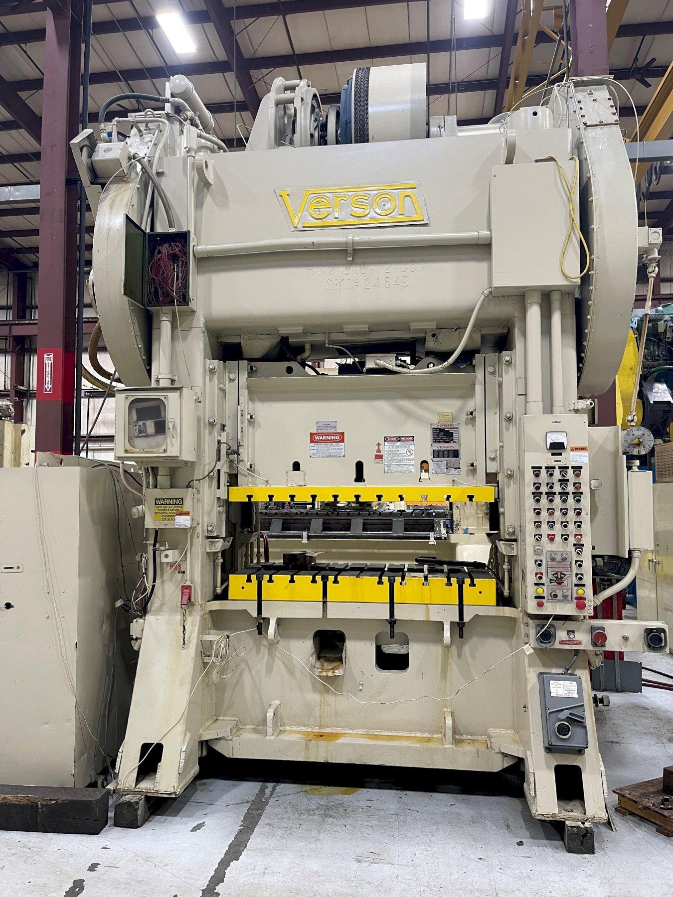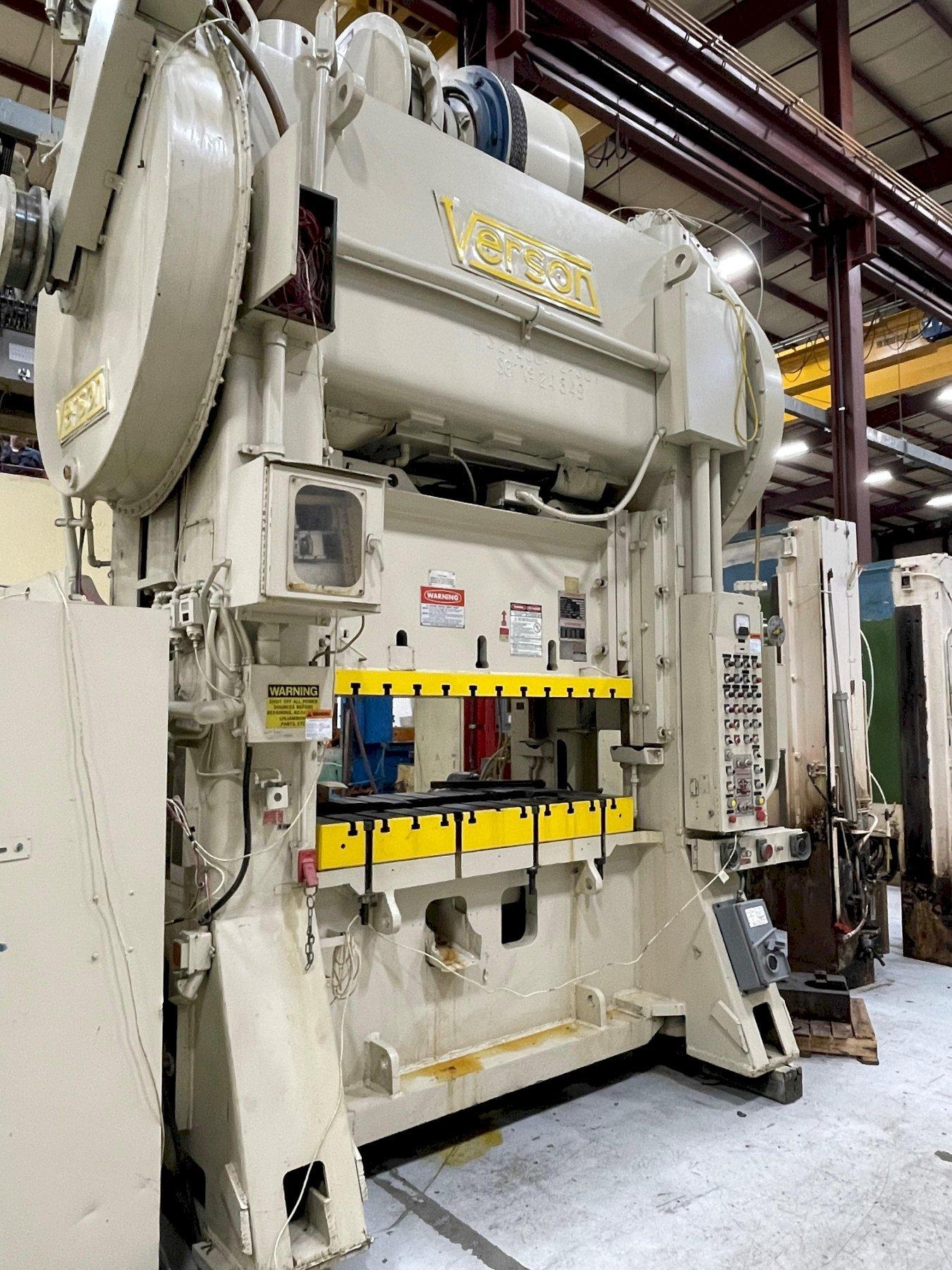 Used Verson Press Model HS2-300-72-36 Straight Side Double Crank Mechanical Press 300 ton Capacity 6" Stroke 6" Adjustment 24" Shut Height (On Bolster) 72" LR x 36" FB Bed Area 72" LR x 36" FB Slide Area 40-80 VSPM Equipment and Features Air Clutch and Brake Air Counterbalances Recirculating Lube System Hydraulic Tie Rod Nuts 8 Point Gibbing T-Slotted Ram and Bolster 7" Thick Bolster Plate 21" Wide Windows 49" Floor to top of Bolster Motors and Controls Floor Standing 16' 10" Floor to Top of Motor - Maximum Overall Height This Used 300-ton Verson Press can be seen under power in the S&G Press Livonia Michigan Warehouse 300-ton Verson Straight Side Mechanical Press For Sale |